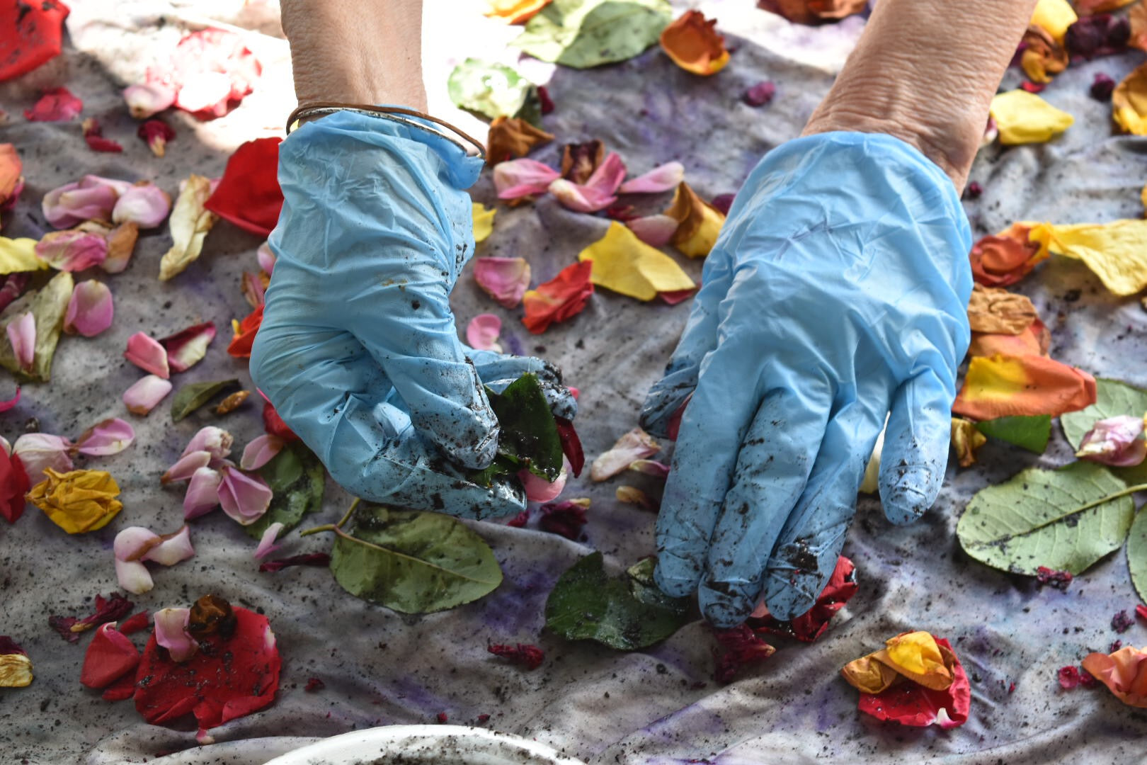 A steaming process that includes painting with natural extracts and laying raw materials on fabric to imprint abstract designs. Super relaxing and always beautiful results. Beginner friendly and kid friendly